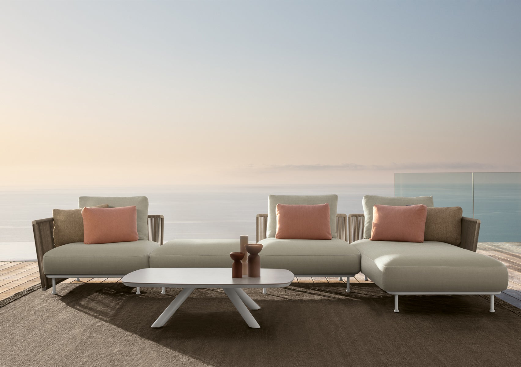 The Coral modular sofa allows you to create elegant and creative sofas combinations to add character to your outdoor living space. The clean and balanced geometries that characterize the entire collection, underline the light and minimal aluminum frame, perfectly matched with the backrest and the armrests in synthetic rope. The cushions, weather-resistant and with removable covers, embellish the product with their generous and welcoming volumes, as well as the carefully selected fabrics. The decorative pillows, available in a vast array of colors, personalize and soften the product, transforming the outdoor space into a unique living zone.